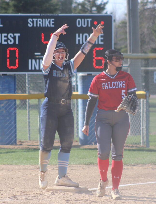 - Photo by Samantha Davis: Russell-Tyler-Ruthton’s Laken Baartmen celebrates after reaching third base against Red Rock Central/Westbrook-Walnut Grove Friday night in Russell.