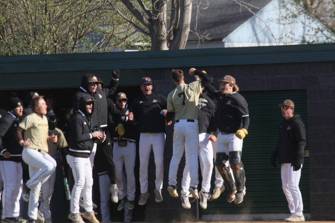 Photo by Samantha Davis: Southwest Minnesota State University's baseball team celebrates a home run by Levi Lampert (7) in a Northern Sun Intercollegiate Conference baseball game against Jamestown, Sunday in Marshall. SMSU took on Wayne State College in a doubleheader on Thursday, splitting the pair of games in Wayne, Neb.