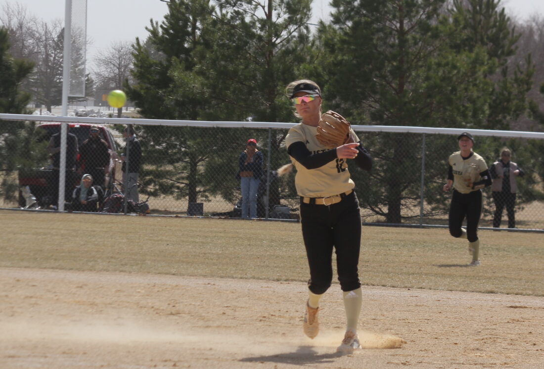 Photo by Samantha Davis: Southwest Minnesota State University's Lexi Ingalls throws to first base against Bemidji State on March 28 in Marshall. The Mustangs split a doubleheader with Sioux Falls on Wednesday.