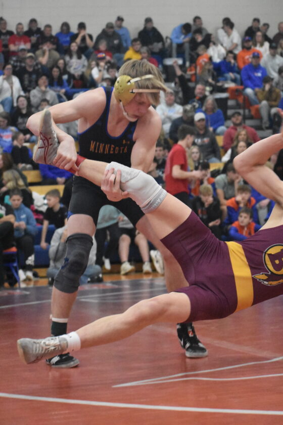 - Photo by Jake McNeill: Minneota’s Adam DeVlaeminck (top) grapples with an opponent during the Section 5A individual championship in Canby.