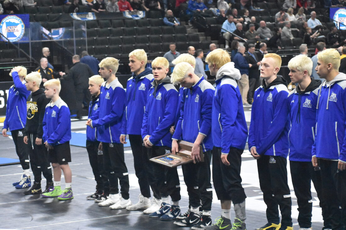 - Photo by Jake McNeill: Minneota’s Adam DeVlaeminck (center) looks down at the Class A fourth-place trophy after the Vikings’ team state third-place dual against Jackson County Central in St. Paul.