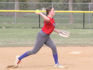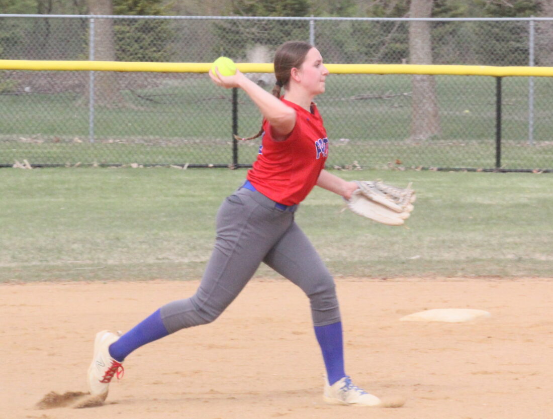 - Photo by Samantha Davis: Tracy-Milroy-Balaton’s Braelynn Kirk throws to first base after fielding the ball at shortstop in the first of a doubleheader against Minneota/Canby Thursday night in Tracy.
