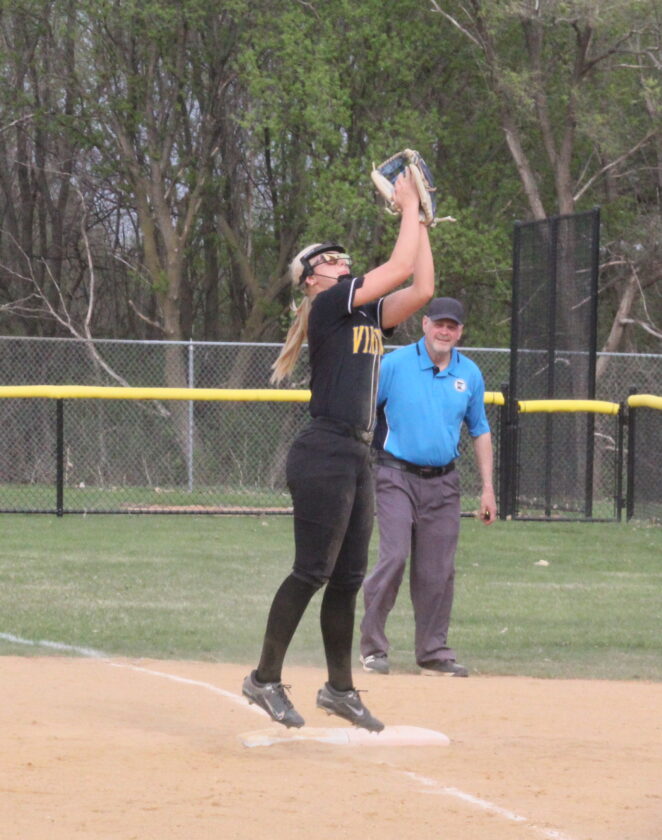 - Photo by Samantha Davis: Minneota/Canby’s Jayla Jerzak catches a fly ball at first base in the first of a doubleheader against Tracy-Milroy-Balaton Thursday night in Tracy.