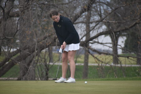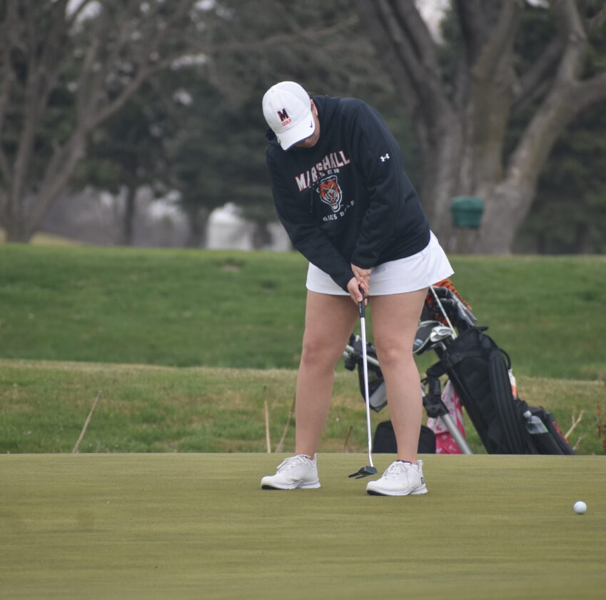 - Photo by Samantha Davis: Marshall’s Dayton Webskowski makes a putt during the Marshall girls golf home invitational on Tuesday at the Marshall Gold Course. Webskowski took first place overall.