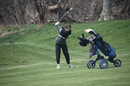 - Photo by Samantha Davis: Minneota’s Ava Panka takes a swing during the Marshall girls golf invitational on Tuesday at the Marshall Golf Course.