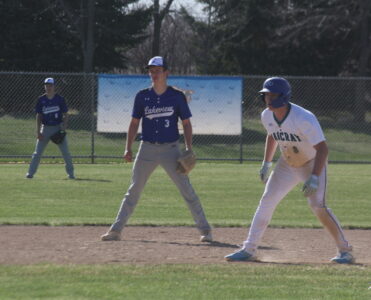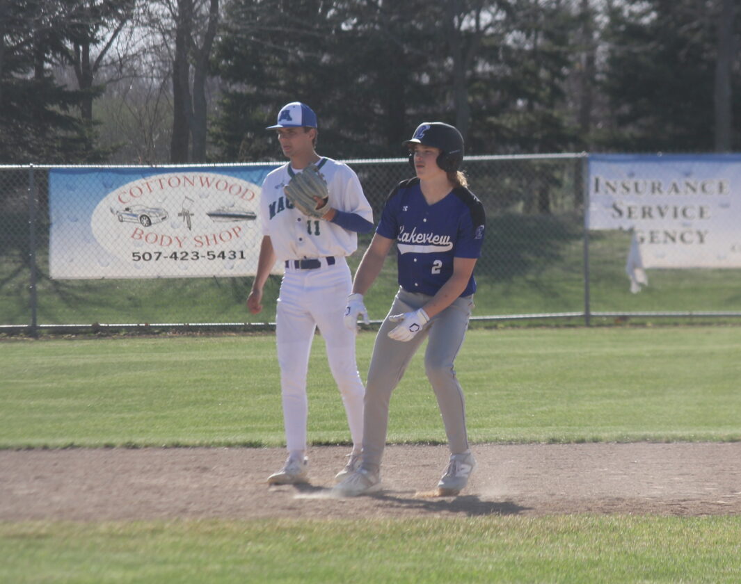 - Photo by Samantha Davis: Lakeview’s Logan Herrick (right) leads off of second base against MACCRAY Thursday night in Cottonwood.