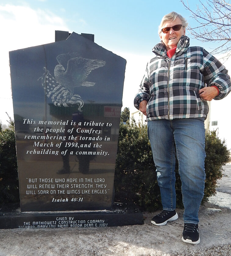 Staff photo by Fritz Busch Former Comfrey Mayor Linda Wallin stands next to a memorial tribute to the people of Comfrey remembering the March 1998 tornado and rebuilding the community. Given by Mathiowetz Construction Company, which led the tornado cleanup, the memorial is located outside the Comfrey Community Center.