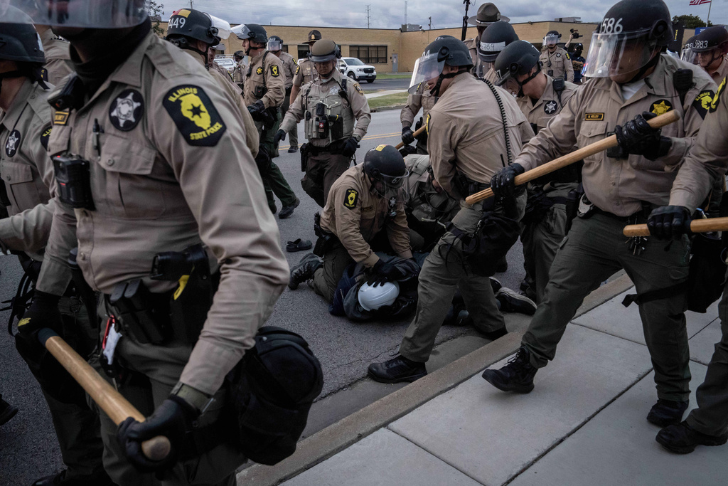 Illinois State Police move in to make detentions after declaring an unlawful assembly outside the U.S. Immigration and Customs Enforcement facility in Broadview, Ill., Saturday, Oct. 11, 2025. (AP Photo/Adam Gray)