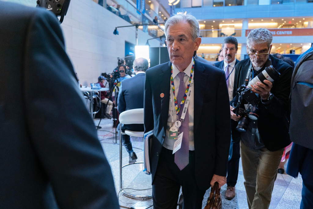 Federal Reserve Board Chairman Jerome Powell walks to a meeting during the World Bank/IMF Annual Meetings at the International Monetary Fund (IMF) headquarters in Washington, Thursday, Oct. 16, 2025. (AP Photo/Jose Luis Magana)